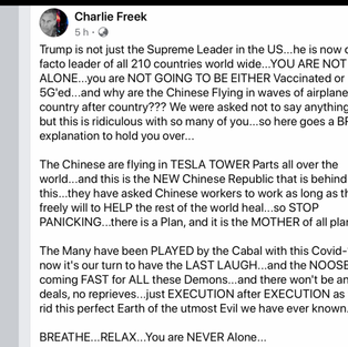 LLinWood1 hour ago·3.4m @linwood Over the next 10-14 days, you will learn shocking information about many of our government officials & wealthy elite. Child sex trafficking and pedophilia are the worldwide pandemic. Revelations will relate to Joe Biden, Barack Obama, Chief Justice John Roberts, Hillary Clinton, Nancy Pelosi, Mike Pence, Jeffrey Epstein, Bill Gates, and thousands more. I have seen the evidence. It is conclusive. This truly is the battle between good & evil.