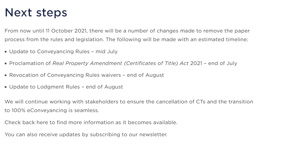 After this date the CT will no longer be a legal document. Landowners with a CT who plan to deal with their land in the next six months should hold onto the CT, even after 11 October 2021. This is because a transaction may begin before this date, but not yet be finalised. In this case, the CT may be needed to satisfy requisitions or other administrative notices that were issued before 11 October 2021. Those who own unencumbered land, but have someone else holding or storing their CT, may wish to request to have it back. From 11 October 2021 there will no longer be a remedy under the Real Property Act 1900 to get a CT back from others, given it has no legal effect.